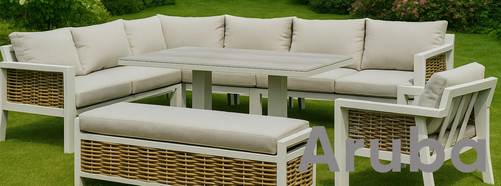 The Aruba Collection combines sleek powder-coated aluminium frames, 13mm flecked wicker, and neutral UKFR-rated cushions with drainable Textilene bases for effortless care. Fully removable with zips and paired with sandstone-coloured ceramic glass tabletops on hydraulic rise-and-fall bases, this all-weather range adapts seamlessly from coffee to dining height, making casual outdoor living stylish, practical, and built to last.