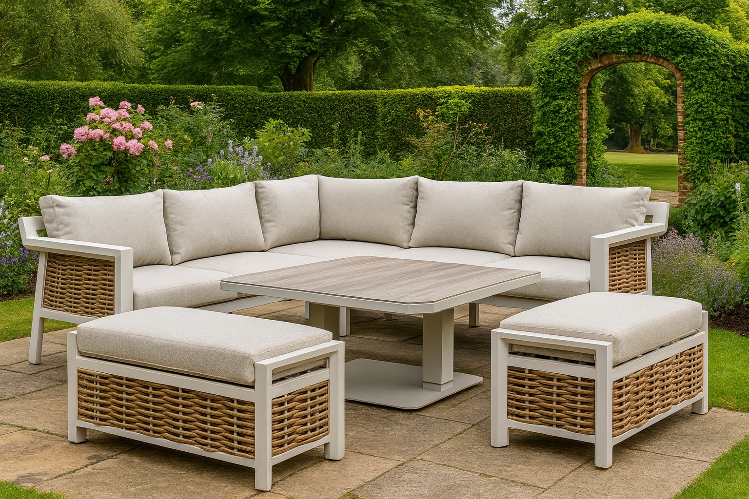 The Aruba Collection combines sleek powder-coated aluminium frames, 13mm flecked wicker, and neutral UKFR-rated cushions with drainable Textilene bases for effortless care. Fully removable with zips and paired with sandstone-coloured ceramic glass tabletops on hydraulic rise-and-fall bases, this all-weather range adapts seamlessly from coffee to dining height, making casual outdoor living stylish, practical, and built to last.